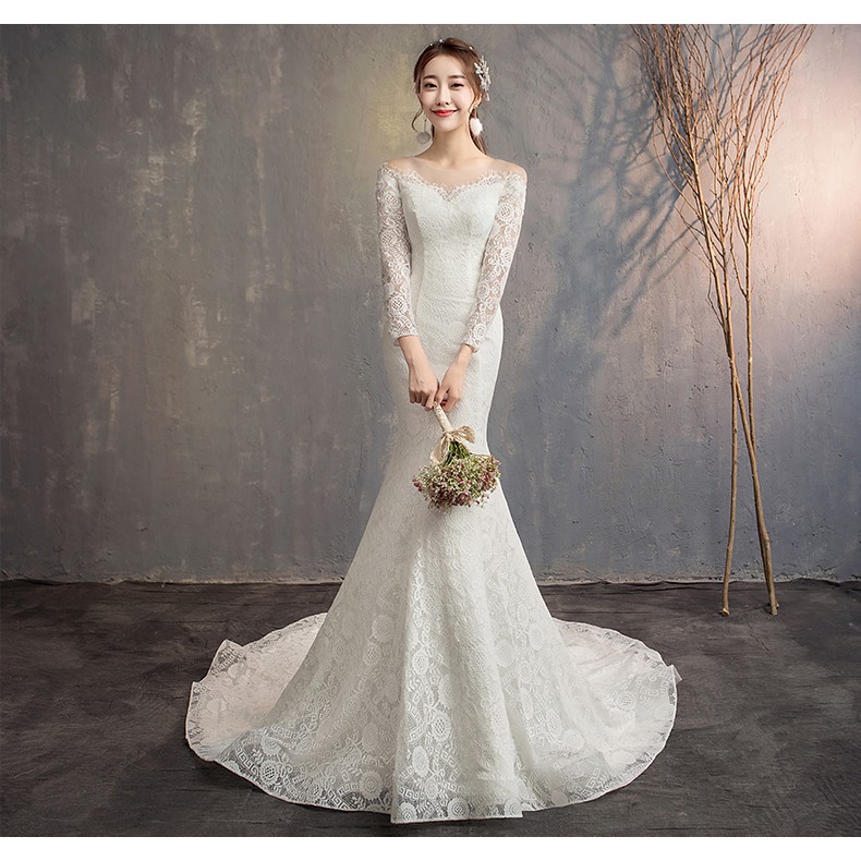 White Mermaid Wedding Dress Long Sleeves Lace Wedding Dress