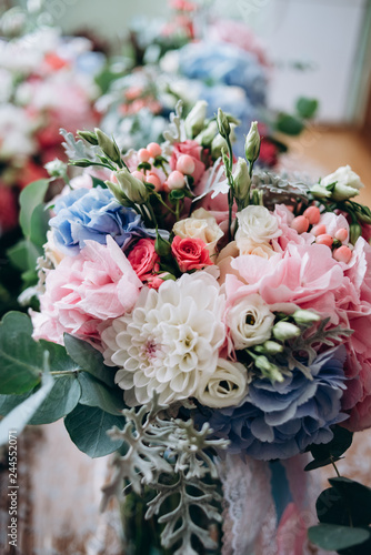 A Beautiful Wedding Bouquet From Blue Red White And Pink Flowers