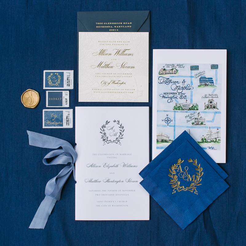 Royal Blue And Gold Wedding Invitation Kits Printed Damask