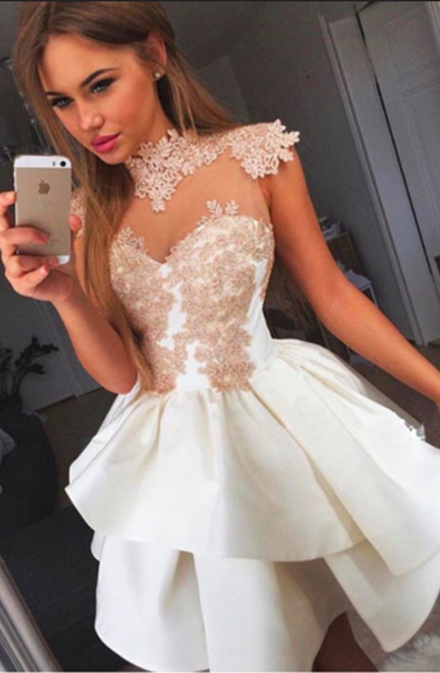 Modest 2018 White Satin Dusty Pink Lace Applique Short Homecoming