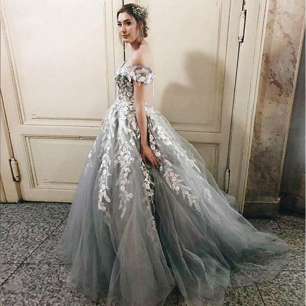 2020 New Grey And White Lace Wedding Dress Ball Gown Off Shoulder