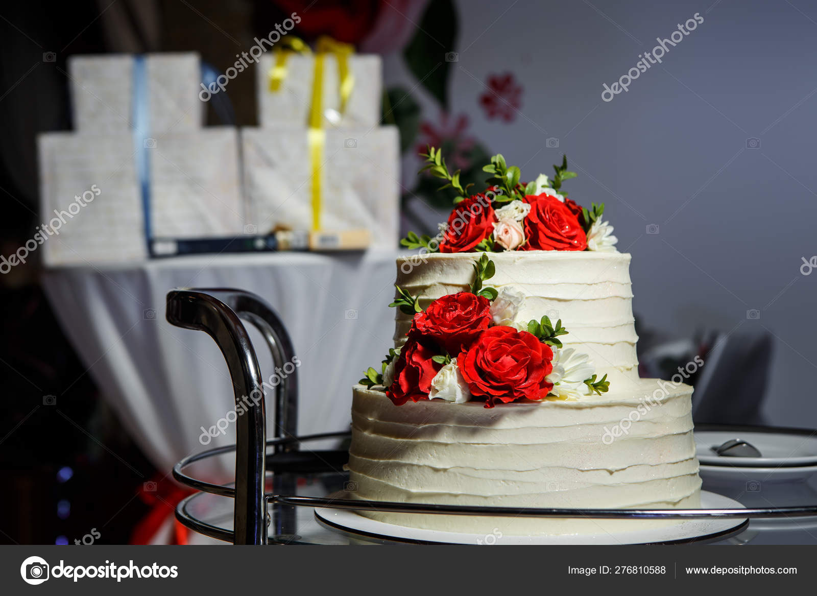 Closeup Two Tiered Cake With Roses On Glass Tray Against Gifts