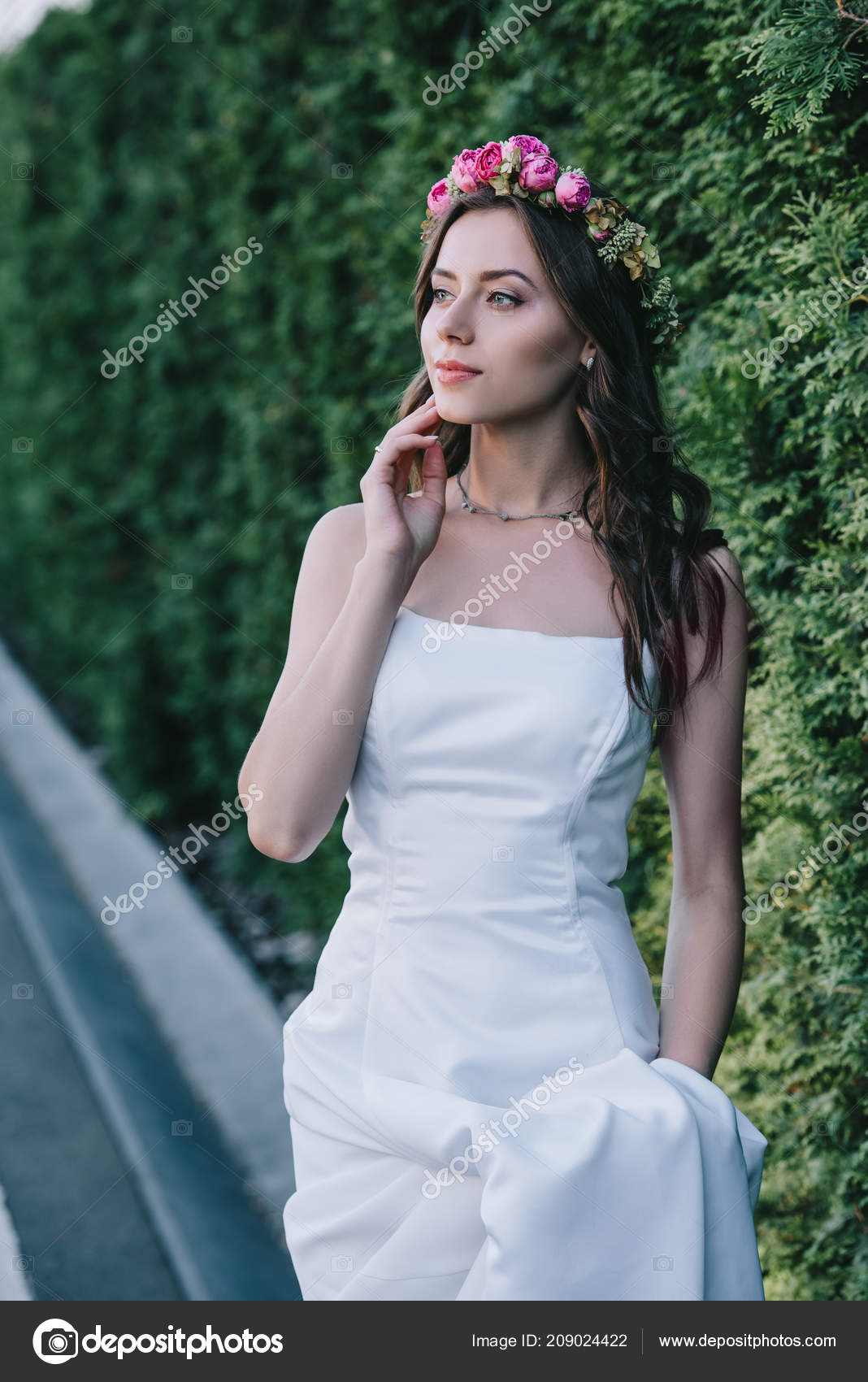 Elegant Bride Posing Traditional White Wedding Dress Flower Wreath