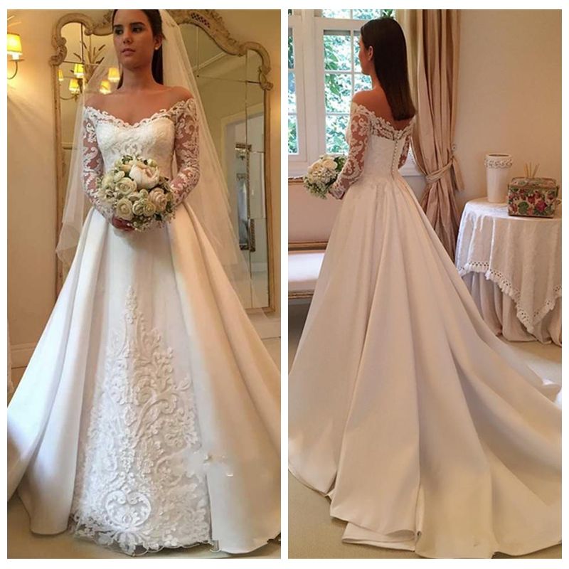 Off Shoulder White A Line Lace Wedding Dresses Zipper Long Sleeves