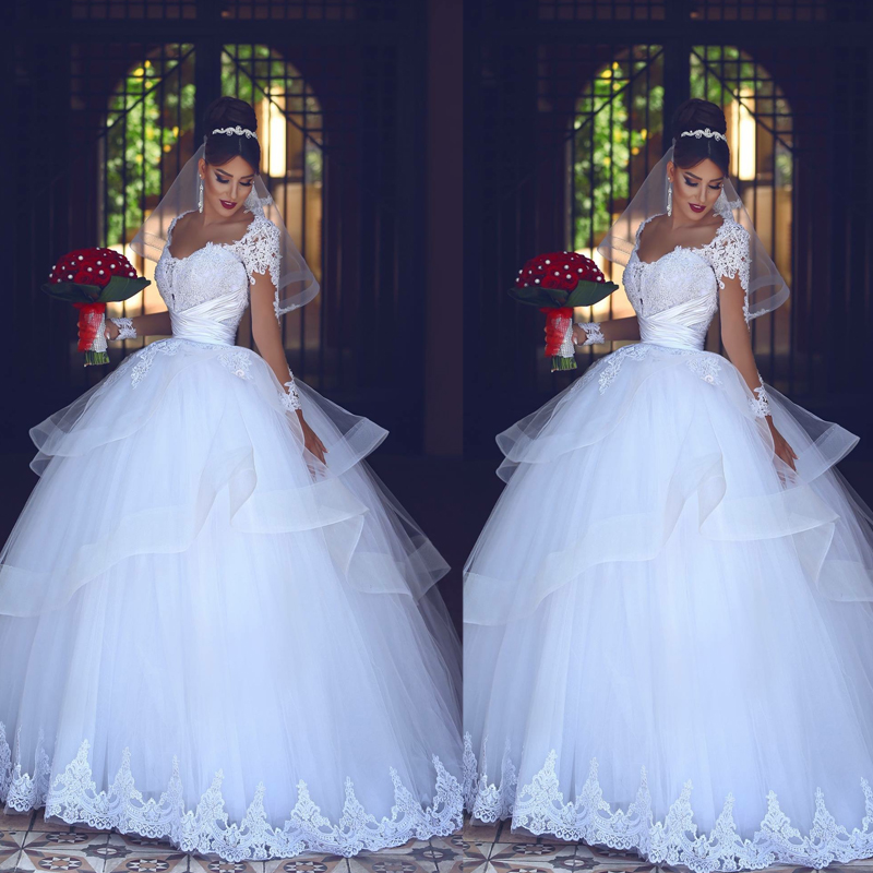 2019 Ball Gown White Wedding Dress Lace Appliques Bridal Gowns