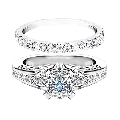 3pc Sterling Silver White Gold Princess Diamond Cut Engagement